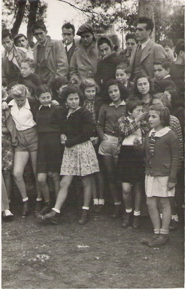 שרה סולו בחגיגת החורשה. לידה עומדים: חוה שצ'רנסקי,דרורה ארקין,ניסים עזרא (בדולח),נתן גוטפליש,נעמי כלב, שושנה יוסף, רנה כרמלי,רותי פולק,דינה ליטרט, יוסף דשבסקי, צבי רוזנצויג.